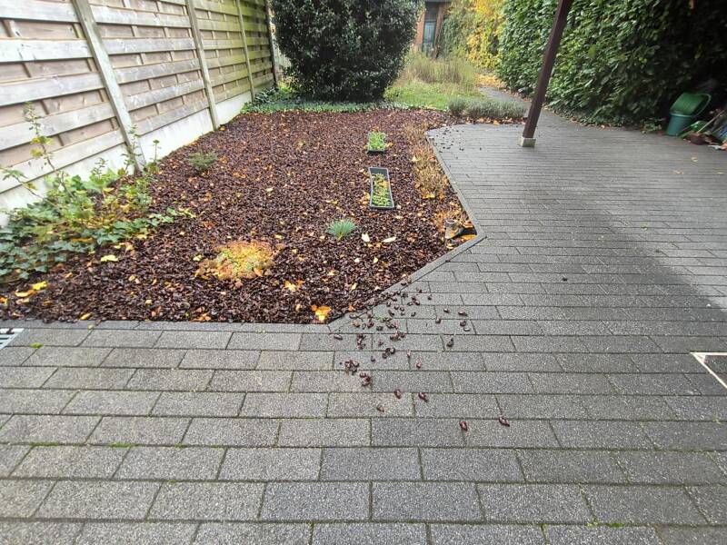 Alleen... wortelmat, boomschors.. . D'r is niks om mee te bedekken. Dus krabbelen die katten d'r zomaar wat op los en elke morgen is Mr. Willy's terras een slagveld van boomschors.