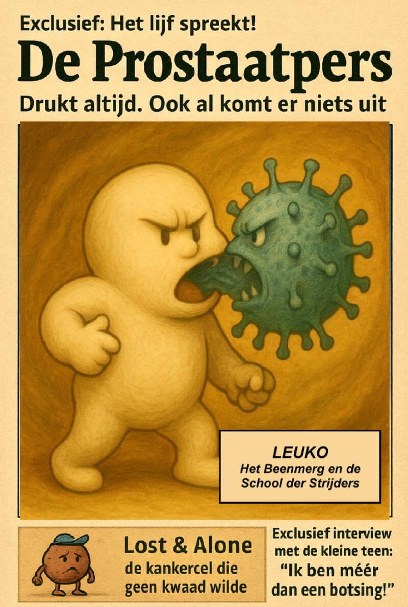 Het begon met een trilling in het merg. Een rilling van bovenaf, bevelen uit het brein, gestuurd door Tumor Prostaat – de Verrader, de klier die jarenlang doodsvlees had verspreid, als een etterende koningspuist onderaan het bekken. Zijn metastatische tentakels hadden zich tot diep in onze beenderen gewurmd, tot het lichaam riep om hulp, en de Chemogod verscheen – met zijn roestige sikkel en zijn rechtlijnige rechtvaardigheid.