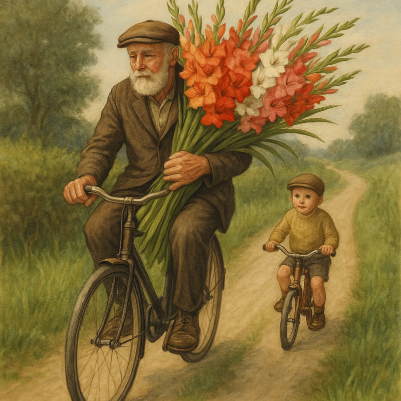 Ik hobbelde erachteraan. Met mijn beroerde evenwicht zwalpte ik van links naar rechts, alsof ik meer van een dronken eend weg had dan van een jongen op de fiets. Soms dacht ik echt dat ik in de gracht zou belanden, maar dan hoorde ik opa roepen: “Hou je recht, jongen, anders verkoop ik jou straks mee als steun voor de gladiolen!” En daar gingen we weer, twee zwaardvechters in het groen, hij als generaal voorop met de gladiolen als zijn trofee, ik erachteraan, bibberend maar trots dat ik hem mocht volgen.