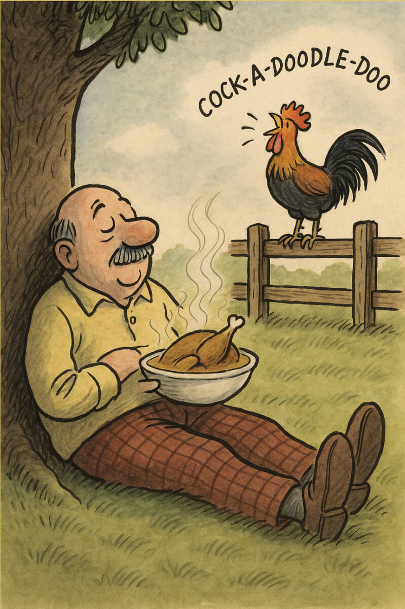Maar dan zie je de keerzijde. Want hoe vol bravoure die beesten ook rondstappen, hun toekomst is eigenlijk triest in zijn voorspelbaarheid: een kort leven, een paar weken trots kraaien, en dan verdwijnen ze via de achterkant van de keuken in een pot waar niemand hun naam kent. Een heel bestaan dat neerkomt op scharrelen, wachten, en hopen dat je niet de volgende bent die in stukjes gaat.