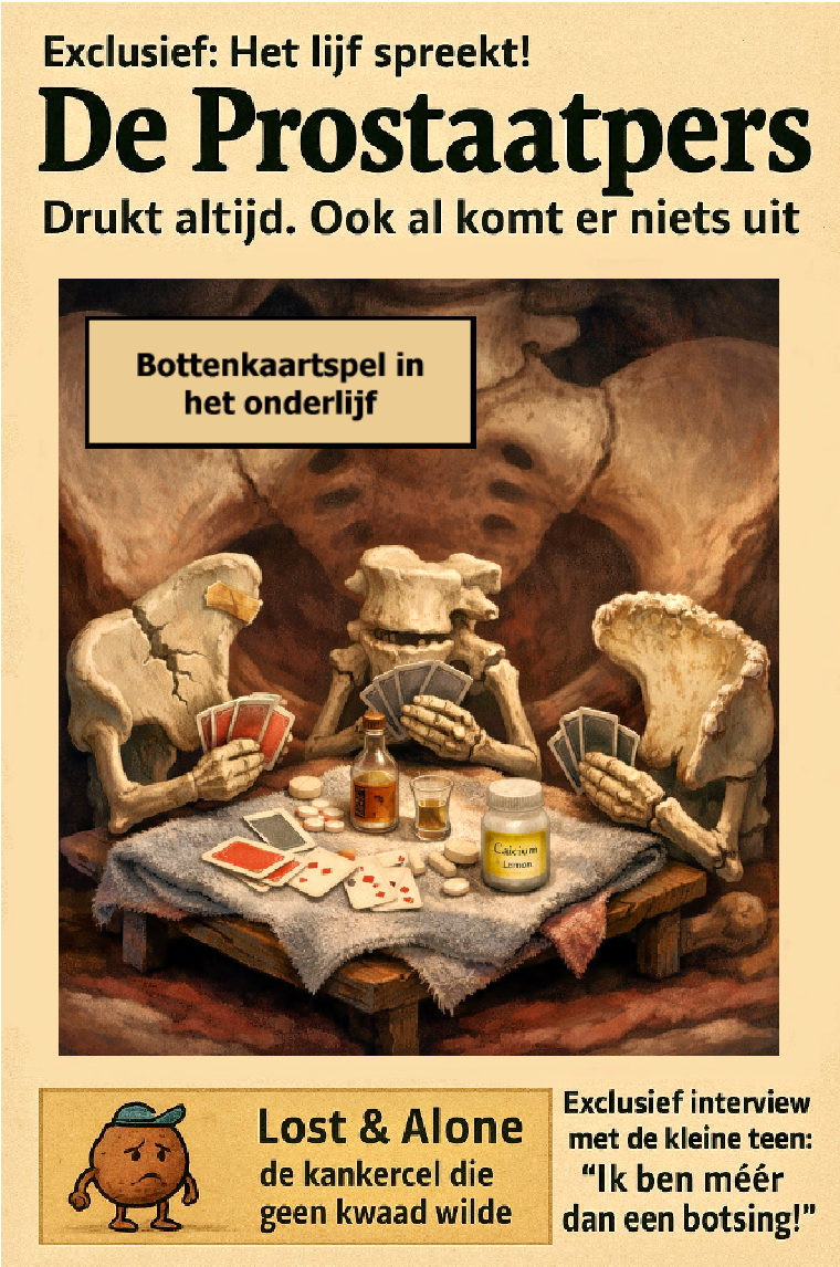 Een artikel in De Prostaatpers dat tegelijk lachwekkend en een tikje pijnlijk herkenbaar is — zoals een slechte rug na een goede dag.