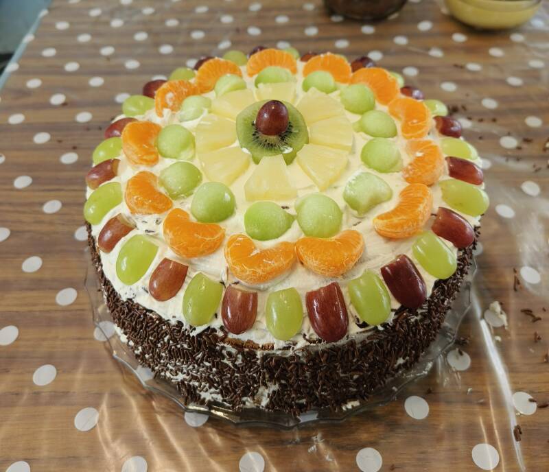 Een eetbare majesteit met een kroon van fruit en een mantel van room, een monument van suikerige trots dat lag te schitteren alsof het feestlicht speciaal voor mij was aangestoken.