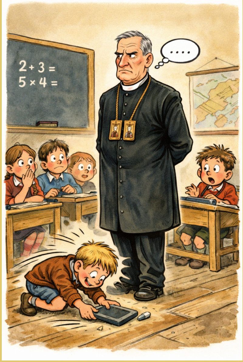 Als er dus een lei op de grond viel, of een griffel onder een bank rolde, dan werd dat een hele onderneming. Heel uitzonderlijk liet De Stijve zich dan, met zichtbaar veel moeite, langzaam op één knie zakken om het ding zelf op te rapen. Maar meestal bleef hij gewoon recht staan, als een lantaarnpaal in de klas, en liet zijn blik streng rondgaan over de banken tot een van ons begreep dat dit een stille opdracht was en zich geroepen voelde om het voor hem op te rapen.
