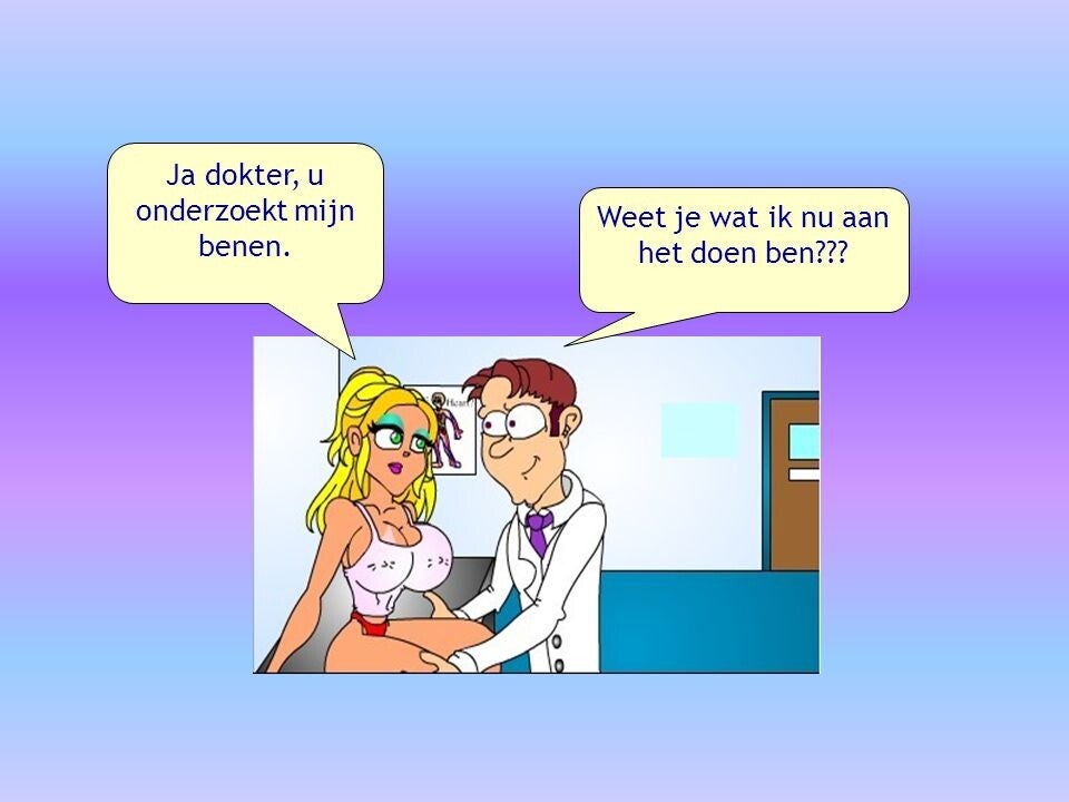 Ondertussen vraagt de dokter “Lekker blondje, wat doet het doktertje nu?”